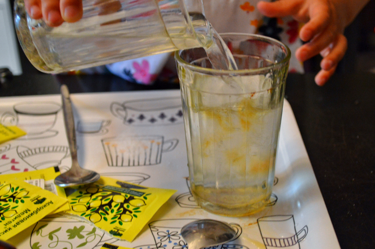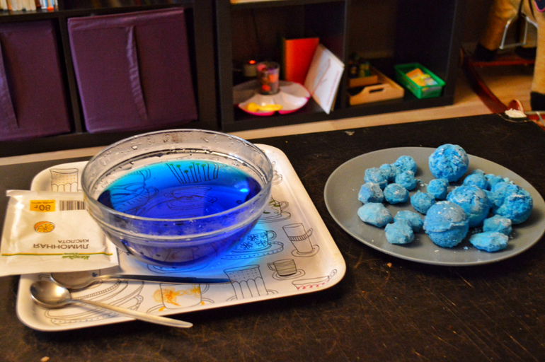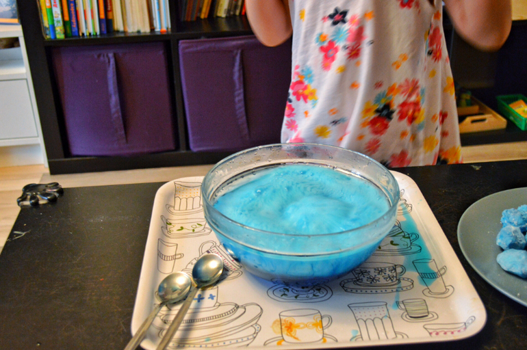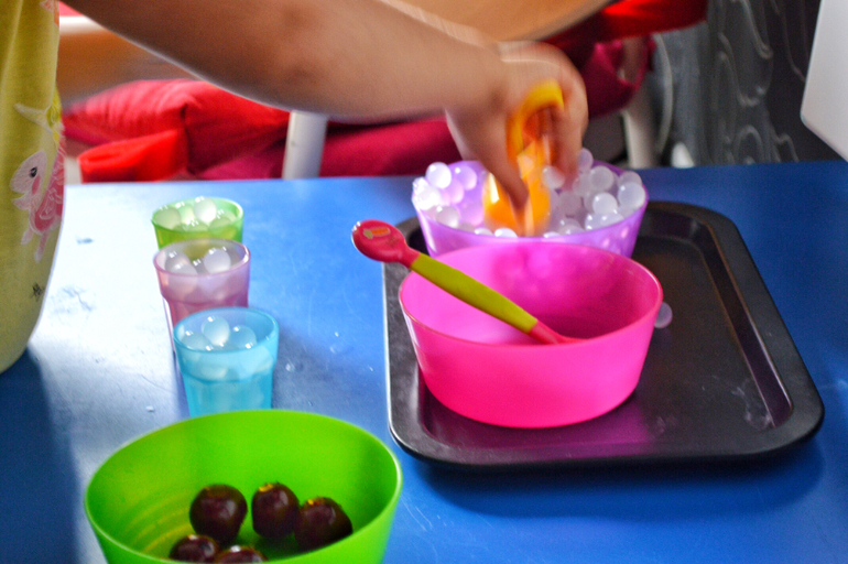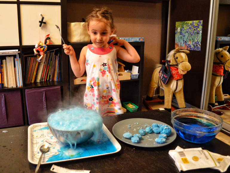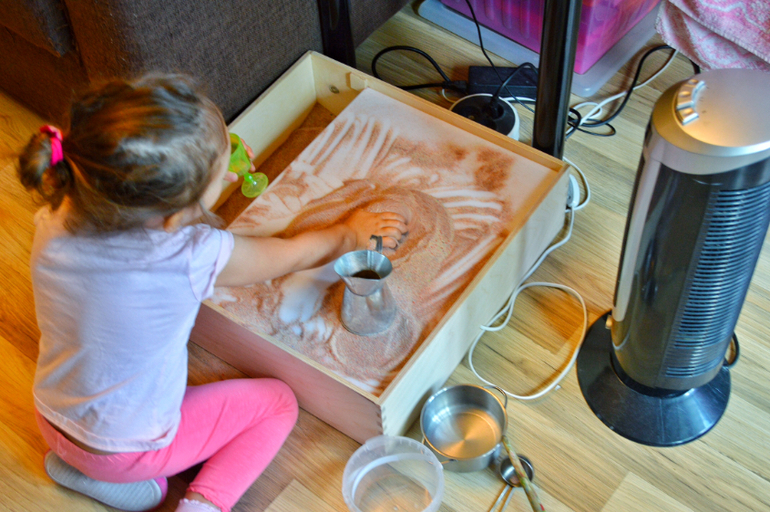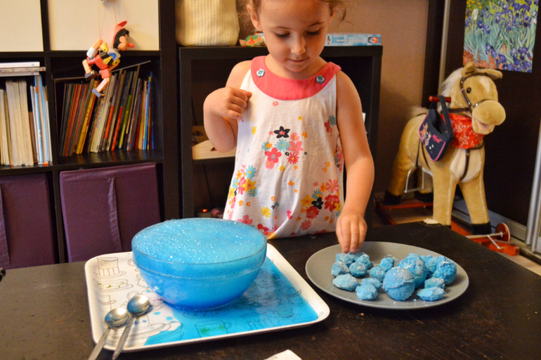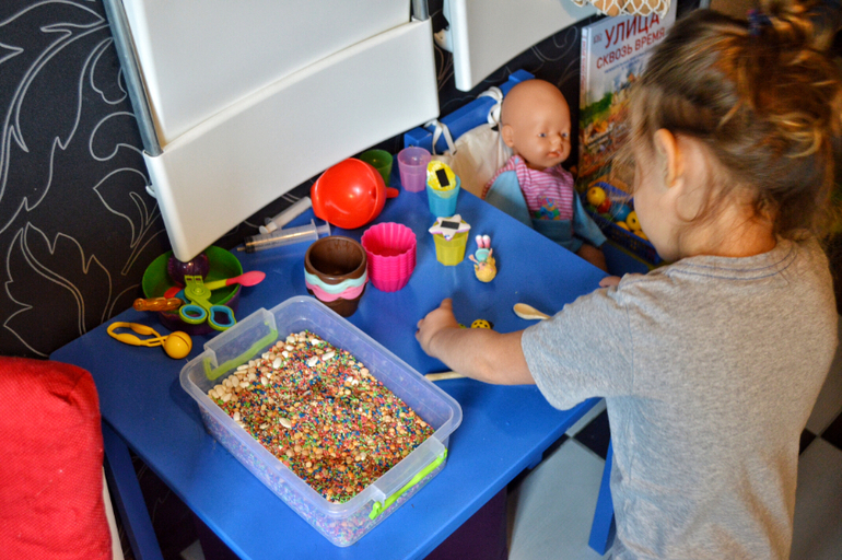 Дэрья очень любит свой синий стол на кухне. Там то гидрогель, то крупа, то вода. Я бы тоже в детстве от него не отходила.