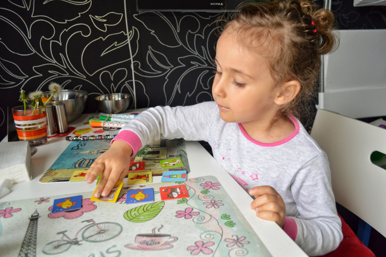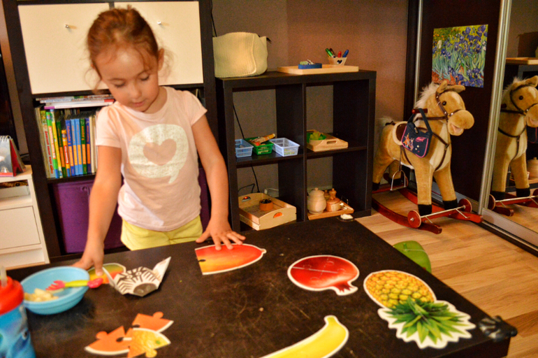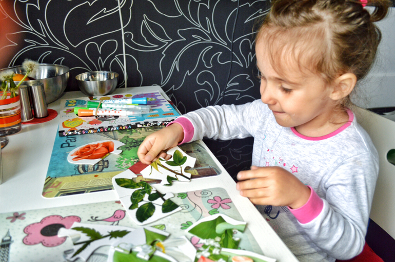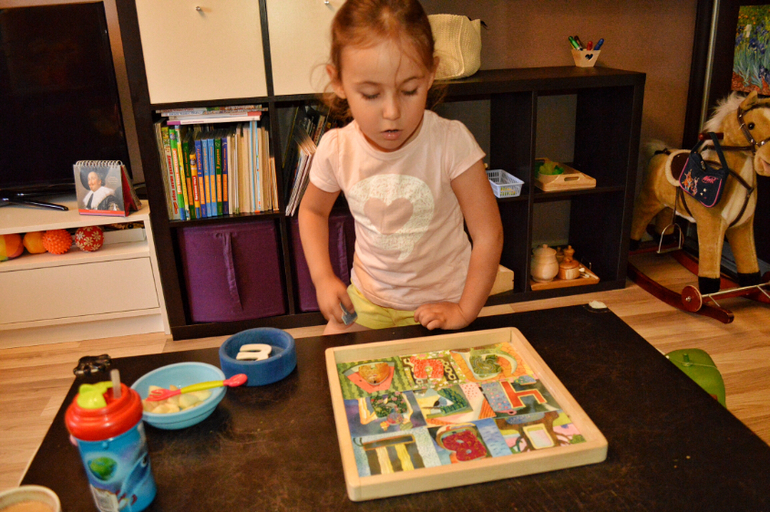 Так у нас за год и не появилось ни одного большого пазла. В процессе совместного занятия или самостоятельно она собирает несколько предметов из 5-6 деталей. Этого вполне достаточно. Таких наборчиков у нас много и дочка просто не успевает запомнить расположение деталей.