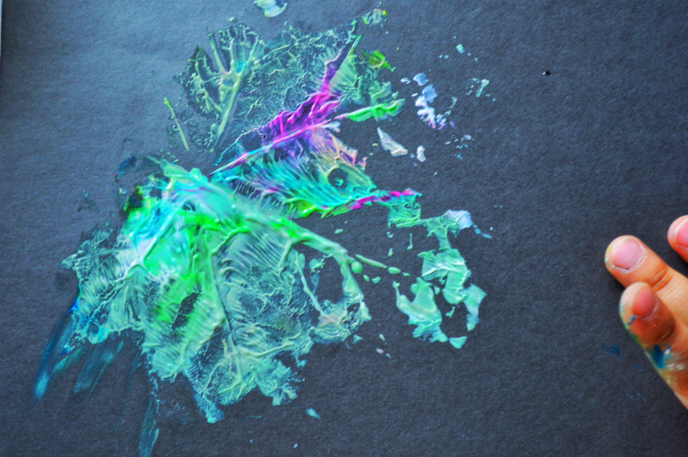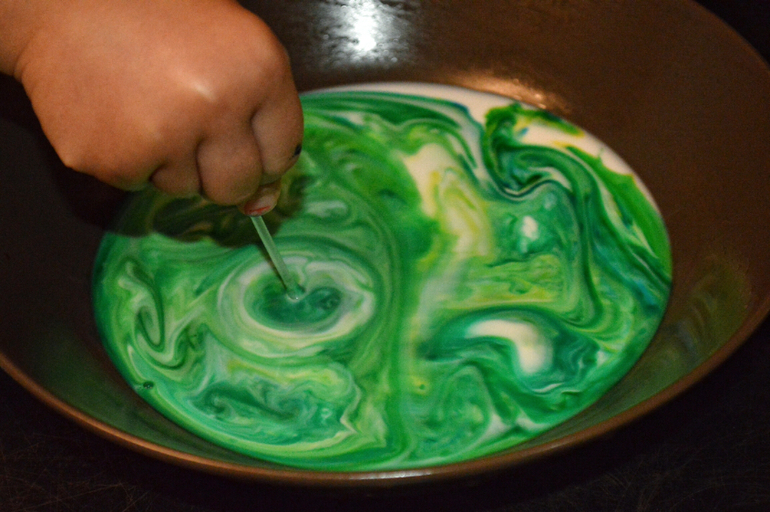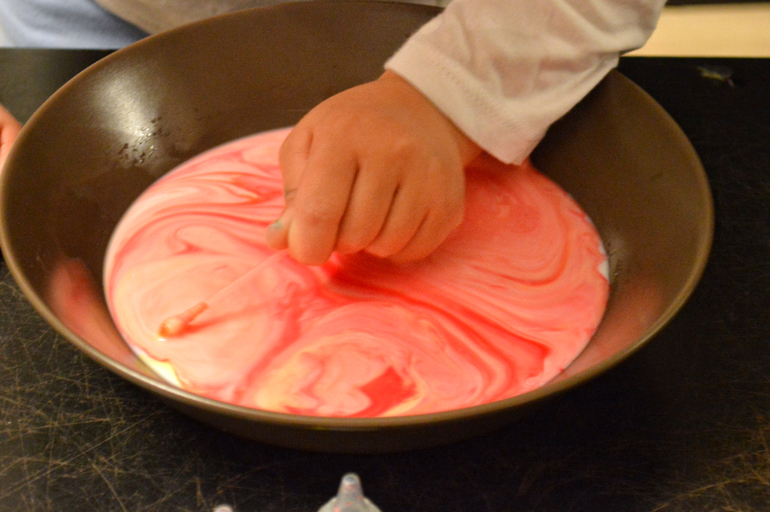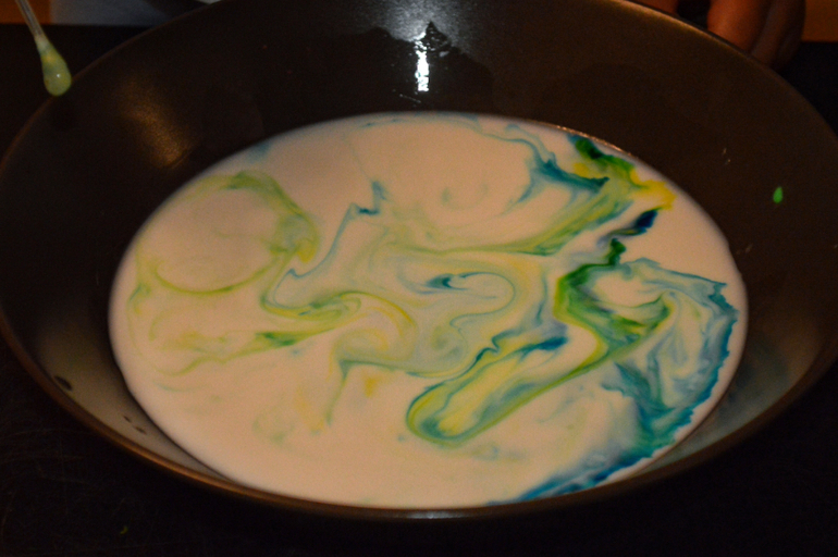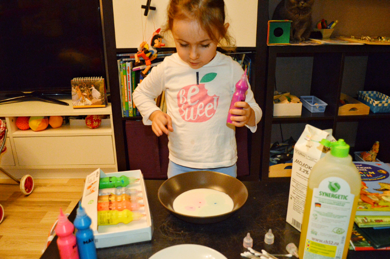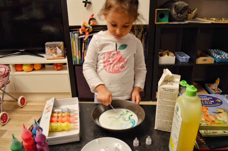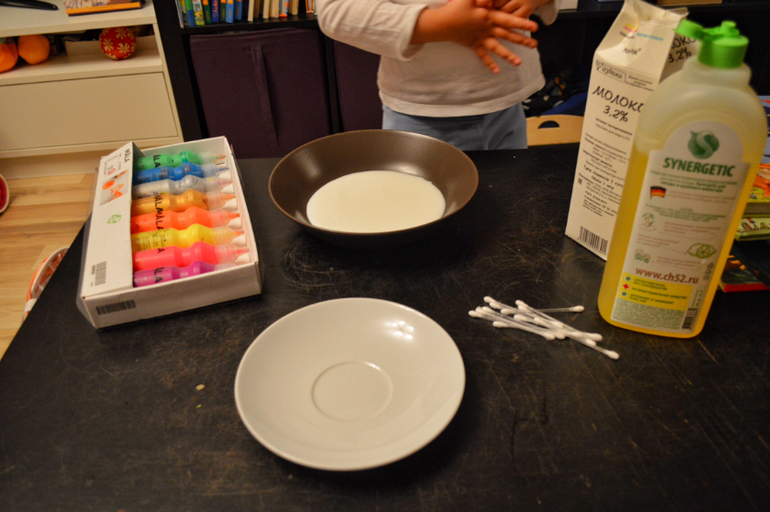 Потом можно к поверхности молочка с красителем прислонить ватную палочку с каплей моющего средства, и красота начнёт движение))