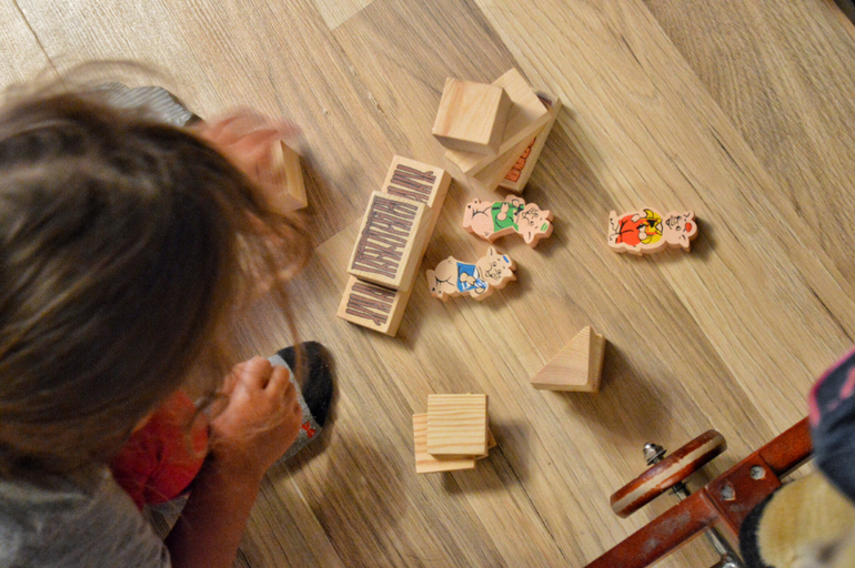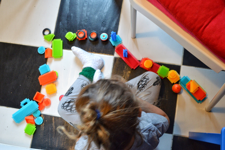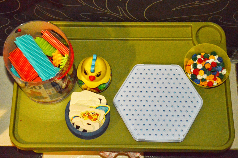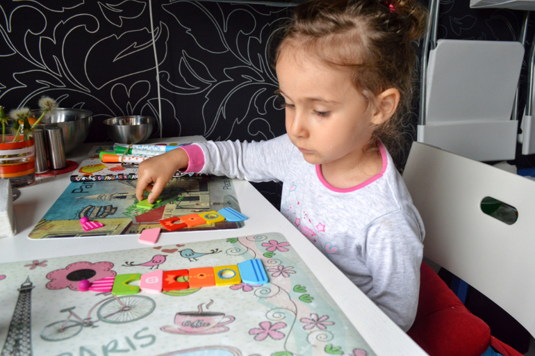 И ещё один столик. С игольчатым конструктором по началу занимались вместе. Сейчас конструирует сама и рассказывает мне истории по своим постройкам.