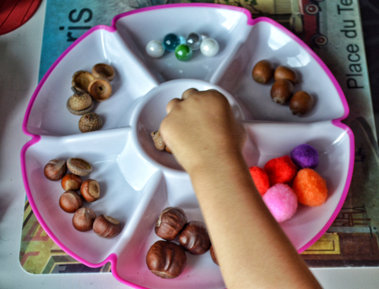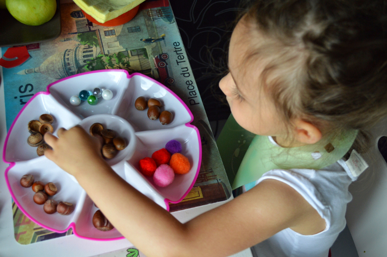 Один из вариантов сортировки и работы с природным материалом ручками или щипчиками. Отличное занятие. Вроде очень простое, но главное для меня в предложенном задании- это концентрация на работе и доведение дела до конца.