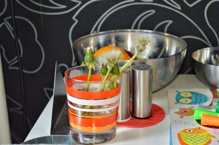 И последний опыт. И самый простой. Одуванчики в стакане. Сорвали желтыми и в течение недели наблюдали за их полным преображением. Я и сама уже позабыла как это происходит. Нам обеим было очень интересно.