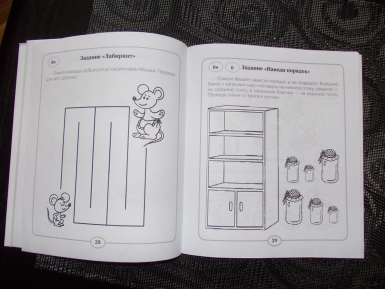 64 страницы развивающих занятий. Книжки выполнены как школьная тетрадь. Картинки черно-белые, но задания нам очень нравятся и есть все: логика, память, мышление, подготовка руки к письму и даже выражение эмоций.