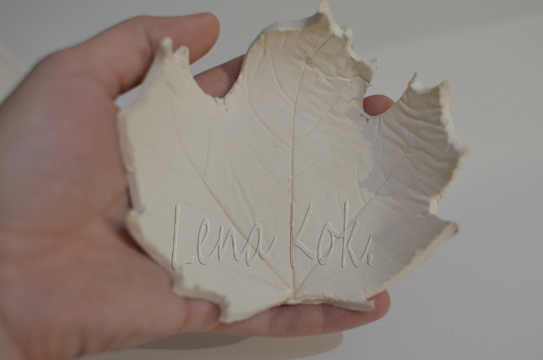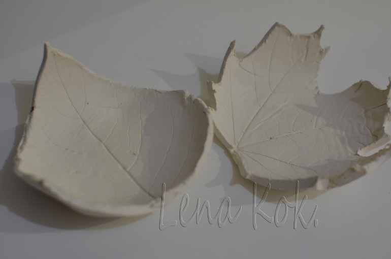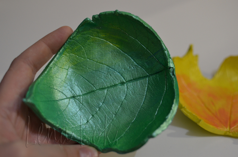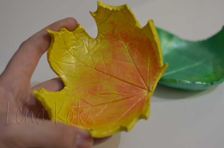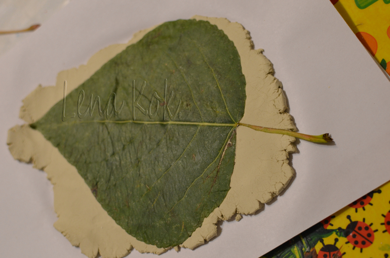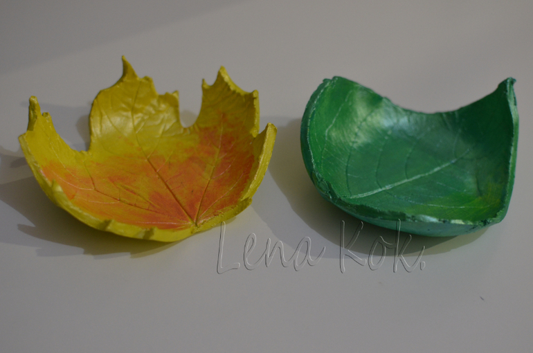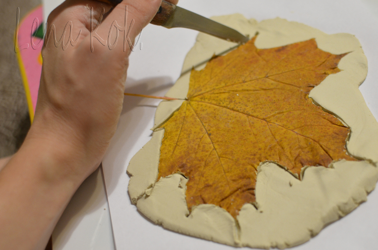 Эти тарелочки из листьев прекрасны, а сделать их не так уж и трудно. Нужно взять массу для лепки застывающую и раскатать ее на листе бумаги, потом положить сверху лист дерева и опять немного раскатать, чтобы листок прилип к основе.