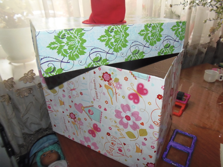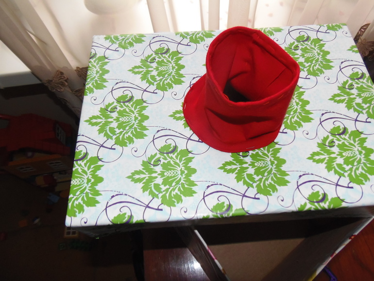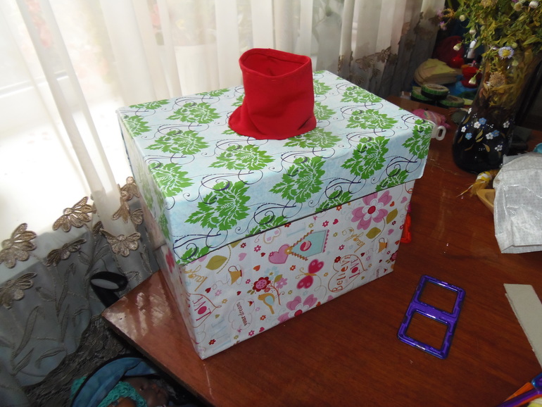 Я взяла обычную коробку, обклеила остатками бумаги для упаковки подарков. Вырезала на крышке отверстие. и сверху к нему приделала манжет. У меня остался лоскут трикотажной ткани от моей юбки