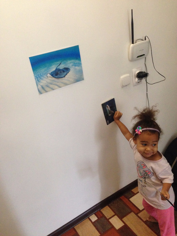 Я даю одну карточку Саре и прошу найти того кто на ней изображён на картинках, висящих на стенах! Она очень радуется, когда находит правильную картинку.. А когда на стене не оказывается кого-то, Сара смешно говорит: "Нее!"