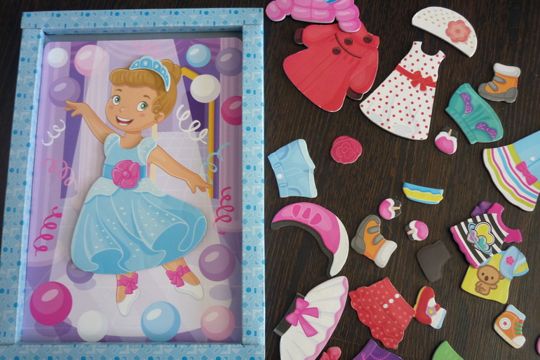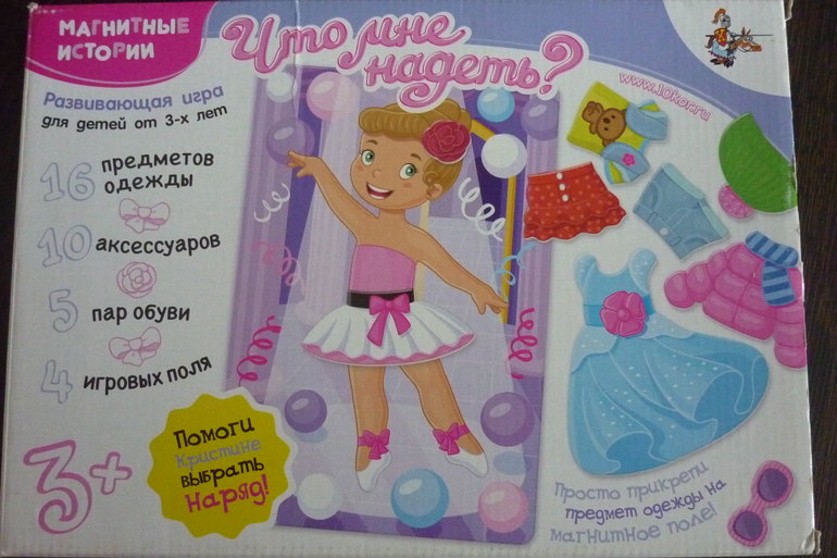 Саше ее подарили на 2 года, но думаю можно и раньше начать играть. Суть игры- нарядить Кристину. Одежда на магнитах, и промагниченное поле.