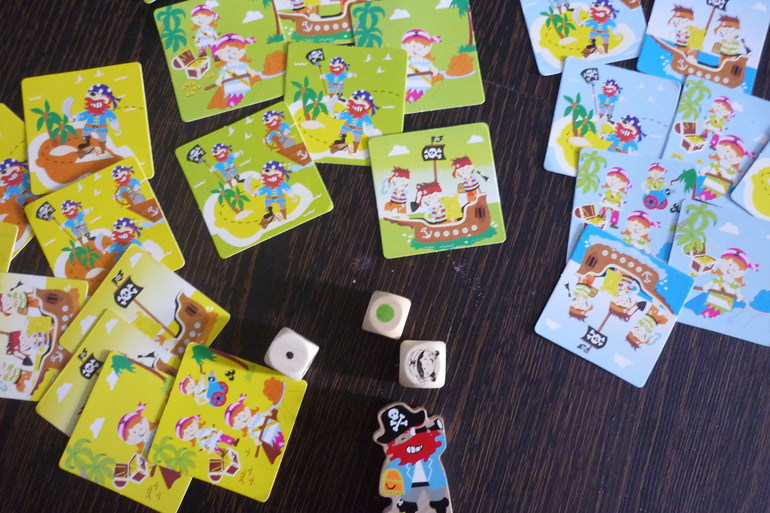 Внутри коробочки находятся 3 кубика, фигурка пирата и 27 карточек трёх цветов,