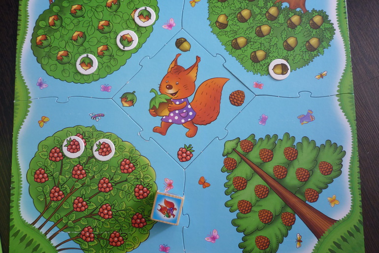 Правила: В начале игры участники собирают игровое поле. Оно состоит из 5 частей. Далее они выкладывают жетоны с орешками, грибами, ягодами и желудями на поле. Для каждого жетона отведено соответствующее растение. Детали мозаики кладут рядом с игровым полем.Броском кубика игроки определяют первенство хода. И затем игра начинается.Игроки по очереди бросают кубик. Если кубик после броска показал изображение любого плода, то он снимает с поля жетон с этим плодом и забирает его себе.Если на грани кубика пустая корзина, то ход переходит к следующему игроку.Если выпало изображение белочки, то игрок выкладывает в центр поля один из 16 элементов мозаики.Игра заканчивается, когда собран весь урожай и на поле не осталось ни одно жетона или полностью собрана мозаика с белочкой.