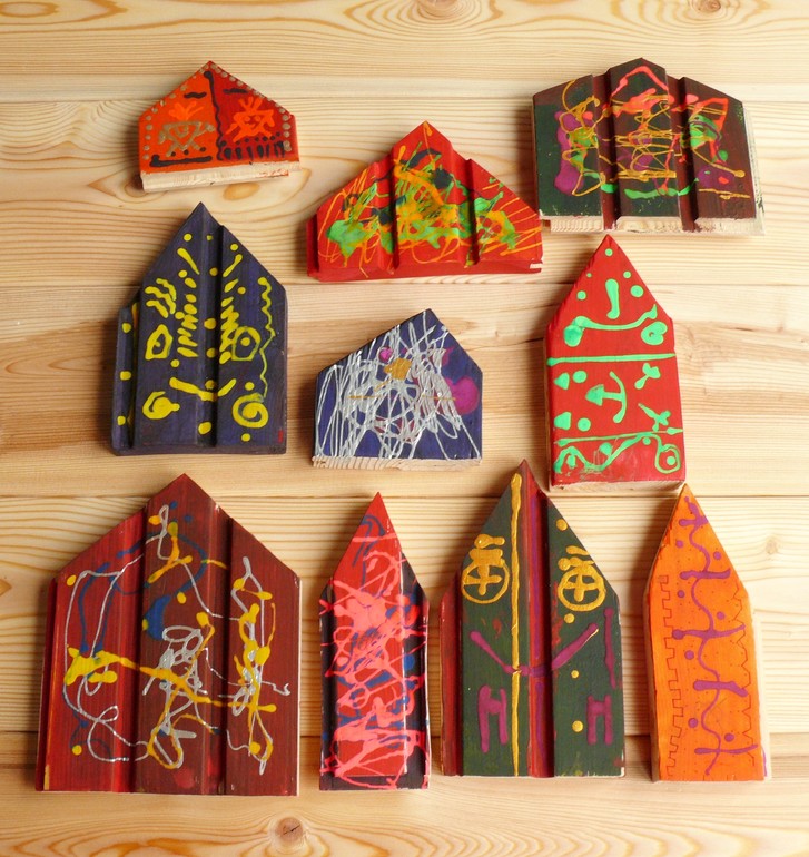 Домики сами выпиливали лобзиком, шкурили и красили с Елисеем 2,5 года и Ульяной, 6 лет.