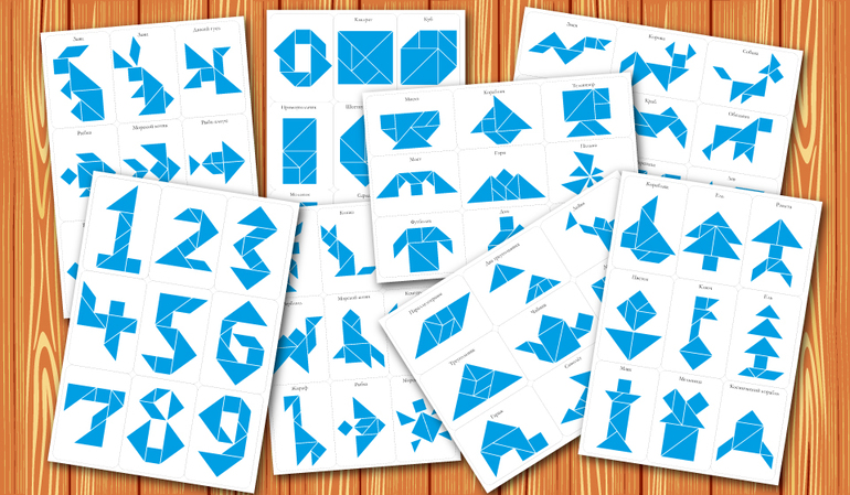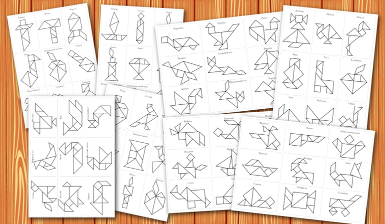 Для начальных занятий с танграмом лучшим вариантом будет использование схем для наложения в натуральную величину фигур.