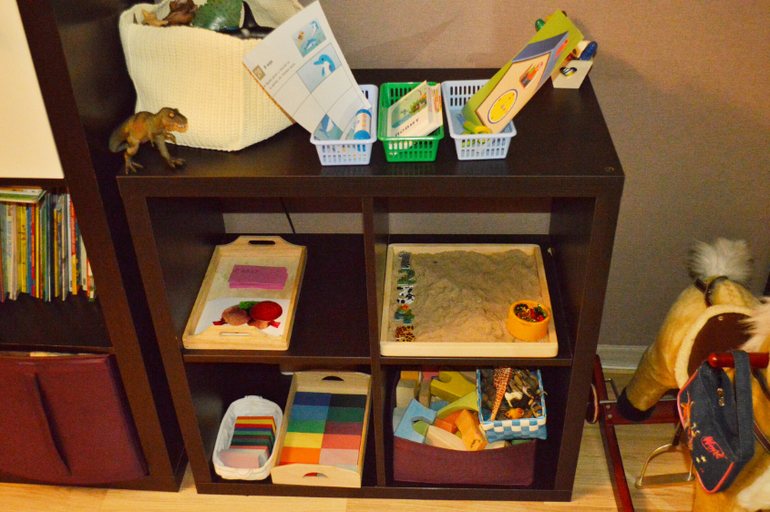 Здесь можно и посчитать и ручку потренировать и поделочку самостоятельно сделать без вездесущих "клей сюда , мажь меньше, смотри как неаккуратно" . Одним словом, занятий на любое настрой. В Монтессори группах конечно все иначе. Материалы разделены на зоны развития, их не обновляют так часто, разве что со сменой времени года. Но там и место позволяет и вообще в домашних условиях ох как непросто все это организовать и систематизировать, довести до автоматизма обновление подносов и минимизировать затрачиваемое на это дело время. Но оно того, поверьте стоит.