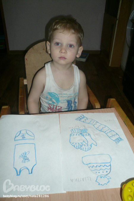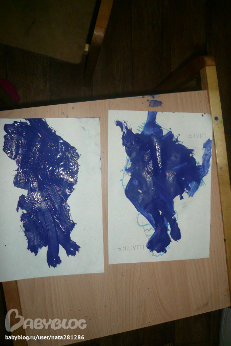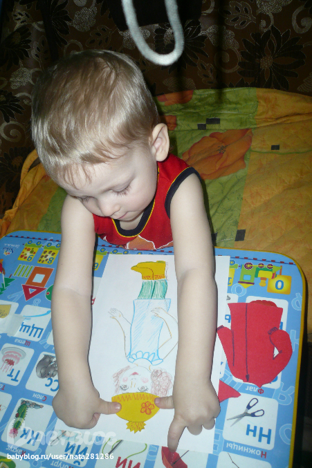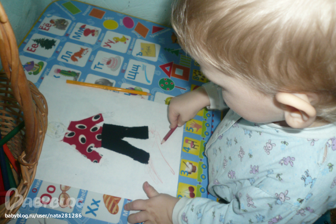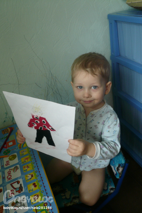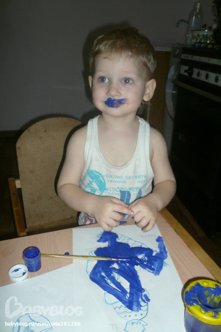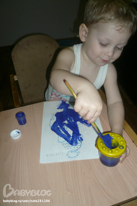 5. Я нарисовала одежду. А он раскрашивал красками. Художник из него не очень, хотя сам процесс нравится. Ушла вся баночка синей краски.