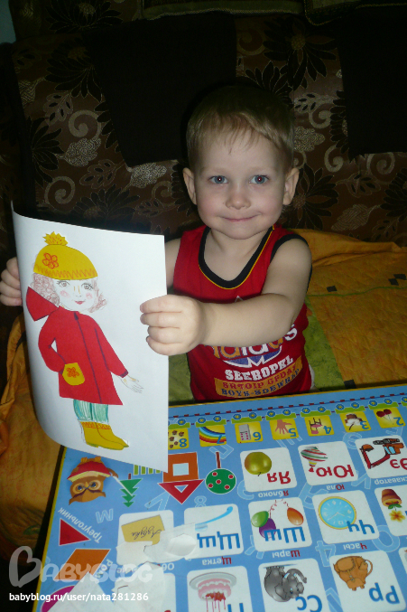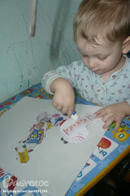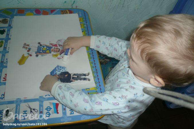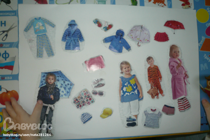 8. Плакат-каллаж. Вырезала одежду и человечков из журнала Мама это Я. Потом наклеили на дверь, помогал, держал.
