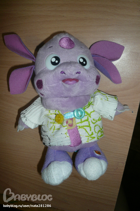 9. Одежда для Лунтика. Сшила на скорую руку кофту для игрушки. Но пока одевать не хочет. Больше понравились лоскутки на него примерять. Лунтик страшный))