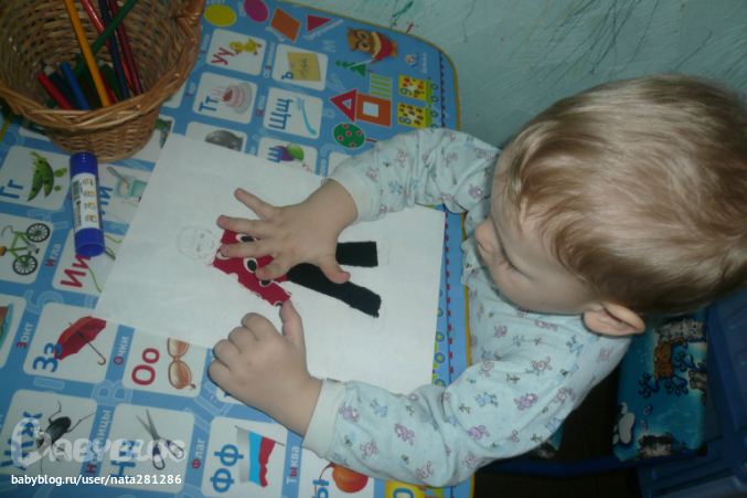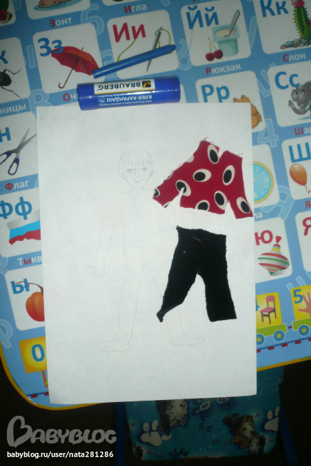 7. Нарисовала человечка и вырезала из кусочков ткани брюки и рубашку. Пока я вырезала, Владику понравились кусочки ткани, да и задание тоже. Ножницы совсем подвели, затупились( Шапку и ботинки раскрашивал карандашами.