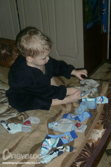 6. Найди пару. Выбрала кучу носков. Но задание начал вроде делать и раскладывал в ряд, а потом понравилось их раскидывать, это было куда веселее)))