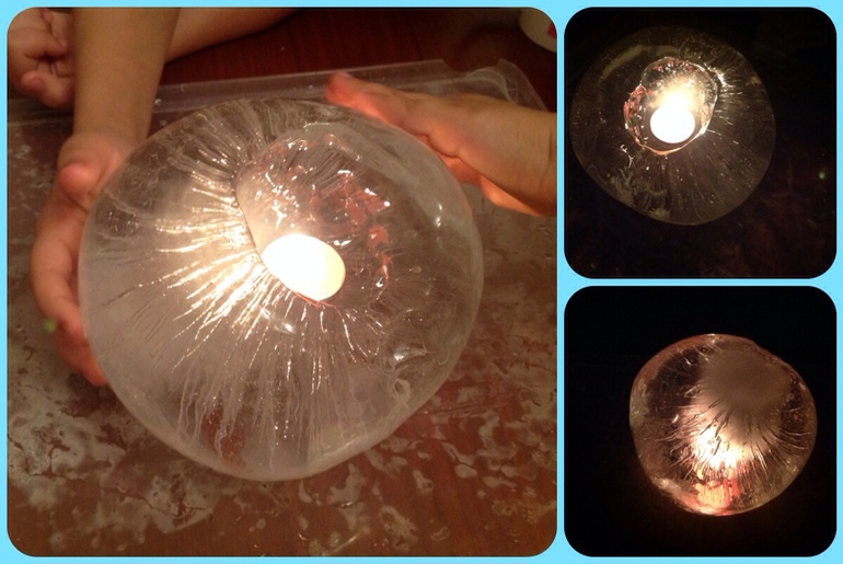 Сделали ледяную лампу. Свечку ставили и снизу и сверху:) снизу гасла:( наверно надо сделать сквозное отверстие...