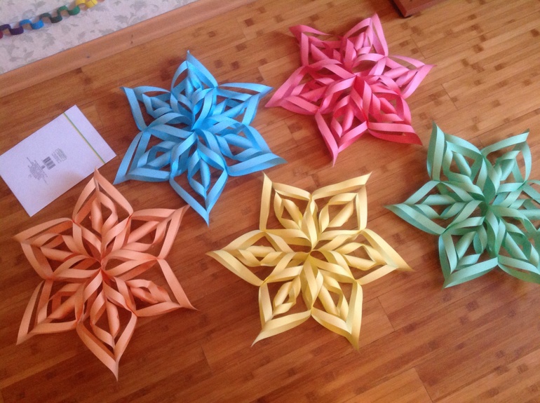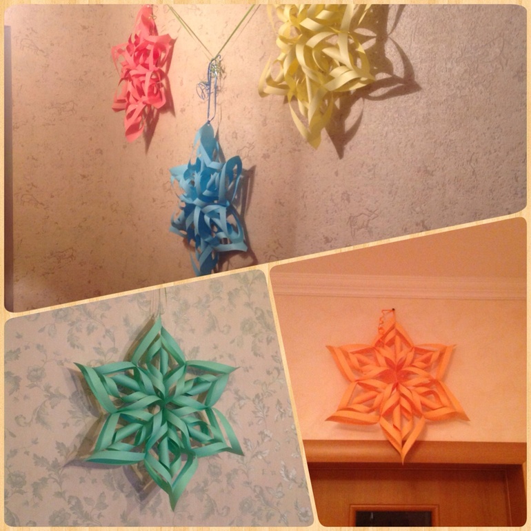 Сделали огромные снежинки. Очень понравилось их делать. Надо попробовать еще с фигурными ножницами.