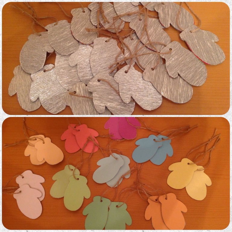 Для одногруппников сына сделали 20 варежек(еще около 30 дома:)) С одной стороны бумага (пастельных тонов) с другой гофра. В серединке для прочности конструкции картон. И веревочка:) своеобразные подарочки друзьям сына - на одной стороне дети смогут нарисовать что-то свое, а потом если захотят украсят свои елочки.