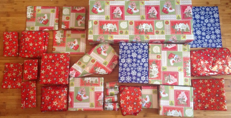 Красно-зеленая упаковка - наши подарки от деда мороза:))) от Снегурочек еще большую гору подарков уже получили :))
