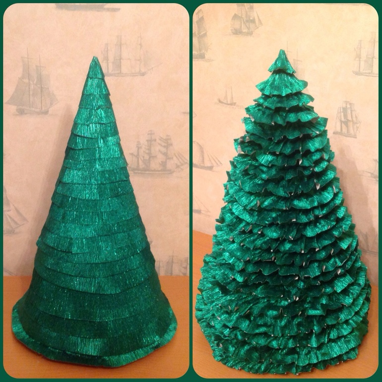 Сделали красивую елочку из металлизированной гофрированной бумаги, и отнесли ее в садик сыну. На фото не понятно размеры, примерно 43 см получилась:)) даже не знаю какая мне нравится больше пушистая или до того как появились рюши...