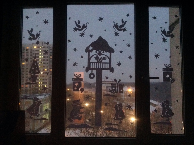 Украсили окошко в кабинете папы. Это готовый наборчик который надо было просто вырезать . Очень мне понравился!!! И быстро (меньше чем за час вырезала) и красиво . Только некоторым персонажам забыла глазки вырезать:) изначально окошко было измазюкано зубной пастой.... Но нашему папе не понравилось... Если вечером на фоне черного неба еще как-то смотрелось, то при дневном освещении выглядело как грязь! Так что такой наборчик очень выручил!