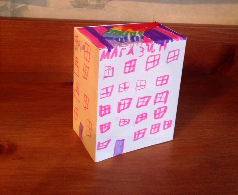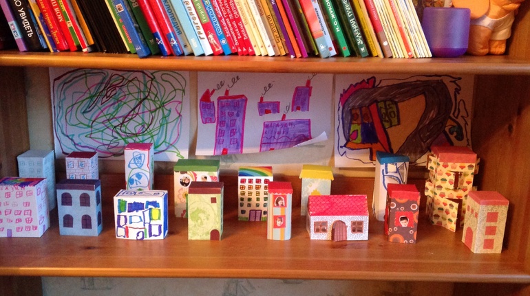 Думала будем и рисовать и аппликацию и объемные. Но нарисованных очень мало а вот объемных много, даже докупили материалов чтоб продолжить строительство городка:))