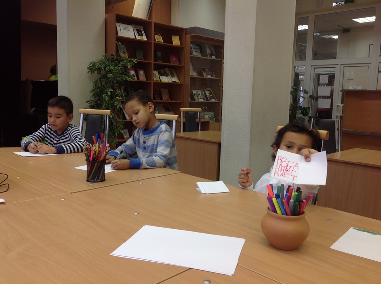 с октября Лео ходит на занятия в библиотеку по программе "Путешествие умниц". Занятия на три месяца с октября по декабрь, 1 разв неделю.