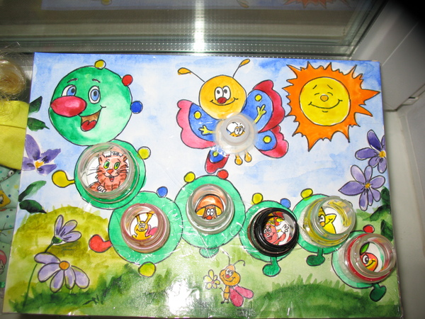 Дочке нравится! Ещё хочу попозже нарисовать рисунки внутри крышечек. Дочка уже научилась их откручивать.