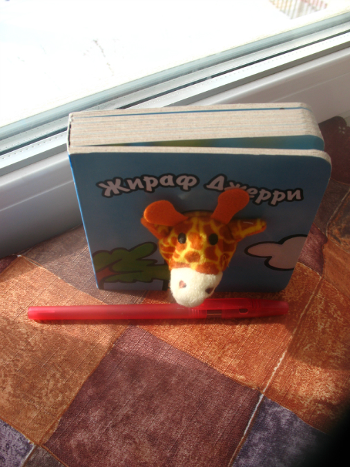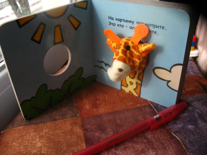 Не посмотрела размер, удивилась при распаковывании)). Размер небольшой, странички очень толстые, жирафик маленький, налазит на один пальчик)), стихи и рисунки понравились). Дочка посмотрела, как оно устроено и теперь считает своей миссией - освободить жирафа, заталкивая его внутрь, по её мнению - выталкивая его из книжки)))