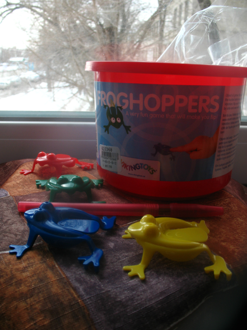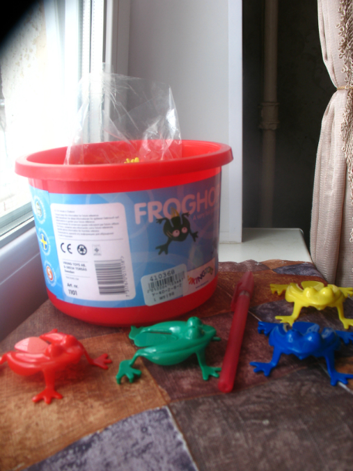 16 лягушек 4 цвета. нам подошли как раз под наши новые самодельные игрушки: баночки. Размер чуть больше крышки от детского питания в баночках. Пластмасса, формой под прыгание), их надо нажимать и они будут прыгать, как-то так)). Теперь дочка забросила основную функцию раскладывания кругов по банкам и занимается с лягушками) и ещё из баночек строит пирамиды)).
