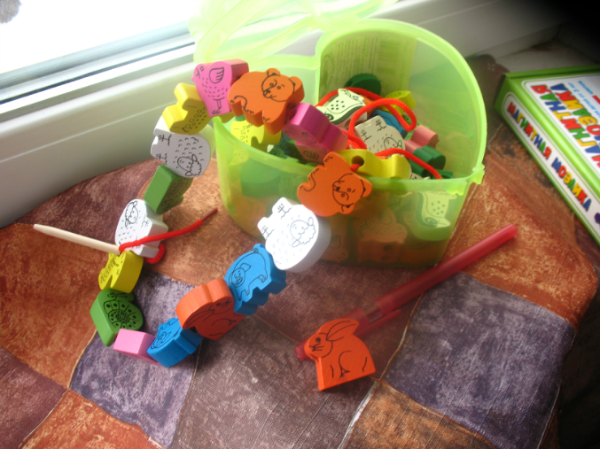 Бусы деревянные, каждая бусина размером около 2 см. Бусины хорошо обработаны, покрашены. В форме зверей, разрисованы контурно с обеих сторон. Ставятся на ребро, можно будет применять и в других играх. Есть два шнура с иголками из дерева, бусы нанизываются свободно.