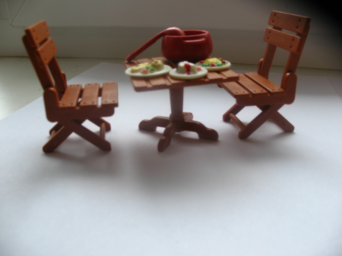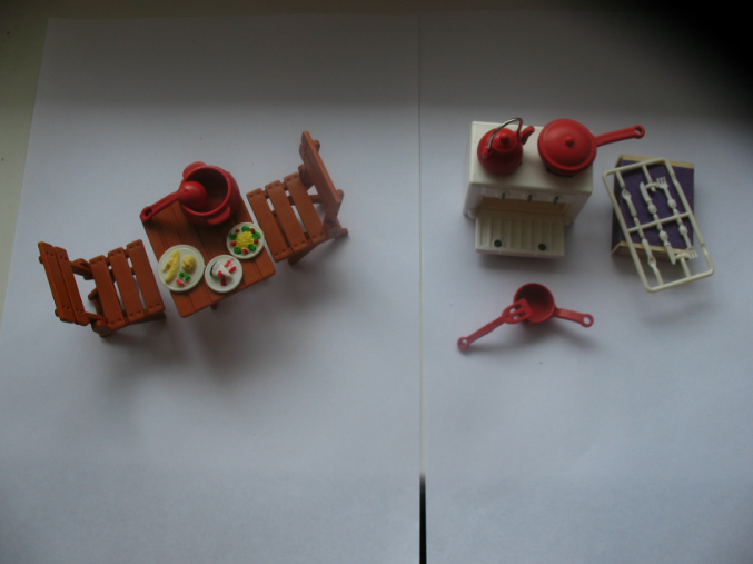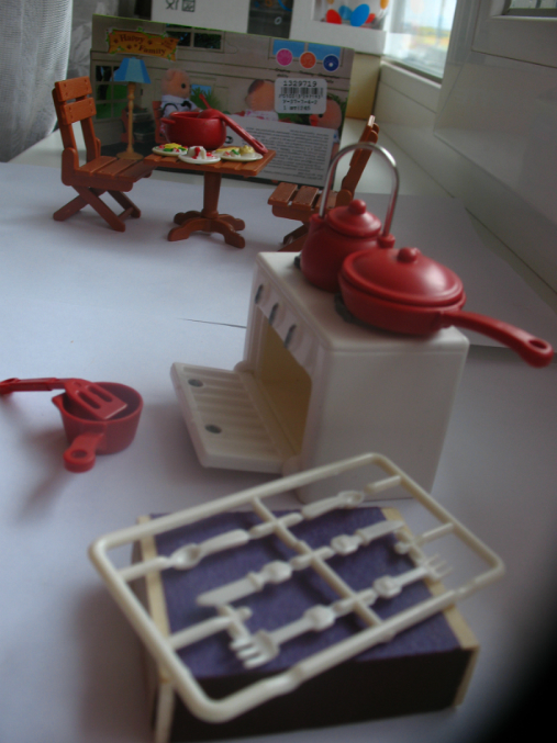 Такой аккуратненький, все раскрывается, собирается-разбирается. Крышечки с кастрьльками, вилочки, ложечки, плита, стол, стулья, ещё и тарелочки с едой.