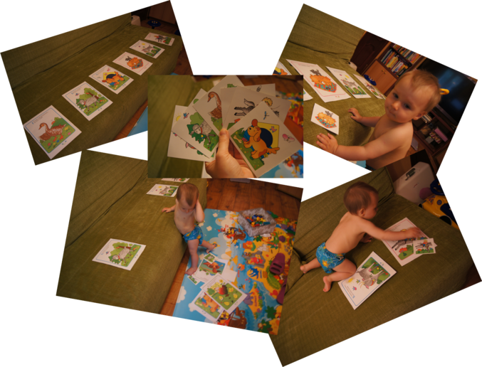 3. Поиграть в игру "Найди пару". Тут я старательно всё приготовила, взяла картинки из книжки "школа семи гномов", карточки с такими же картинками. Всё разложила аккуратно. А потом пришёл Сашка и всё раскидал. Раскидывать было весело! :) Вообще я, конечно же, понимаю, что он не будет сходу с умным видом всё раскладывать правильно. Поэтому мы с ним потихоньку тренируемся в масштабах 2-3 картинки с парами. Но я думаю, что немного модифицирую карточки, чтобы было удобно играть, например, сидя за столиком.