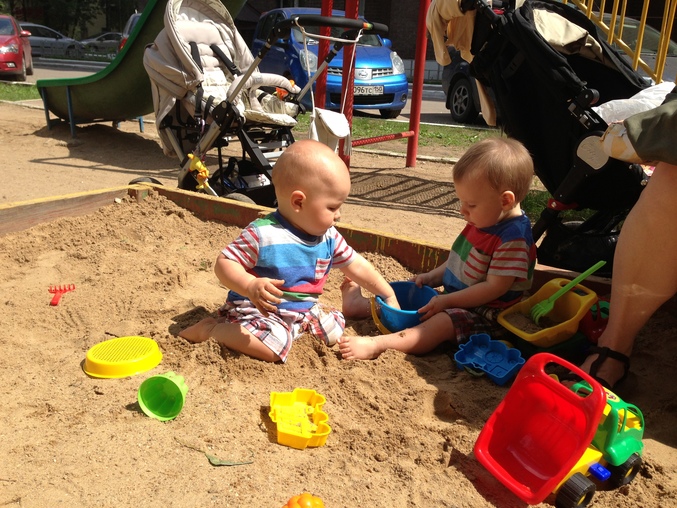 Куличи и замки строила я, поэтому сфотографировать меня было некому :))) Сашка пока любит всё разрушать. Но песок в самосвале он возил, кстати :) А на фото Сашка с другом Тёмой