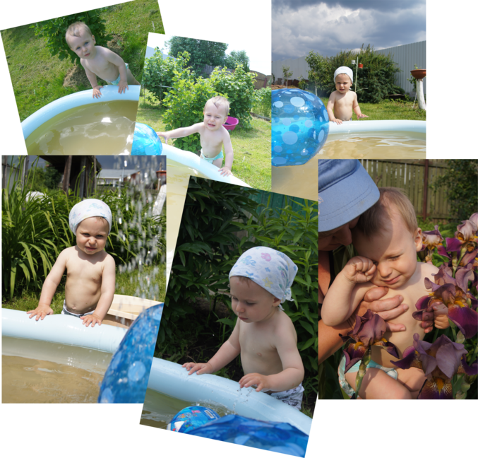 2. Плавать, плескаться и дурачиться в бассейне на даче. Тут мы наигрались отлично! Жаль, что нам не способствовала погода для полного погружения в басс, но зато мы кидали мячики, поливали их из лейки, хлопали по воде, запускали в бассейн маленькие пластиковые ведёрки (типа пирамидки), лили на себя воду, мочили ножки. Сашка очень классно утомляется от этих игр - сразу отрубается. На последней фотке вы можете видеть, как он чуть не уснул в ирисах ))