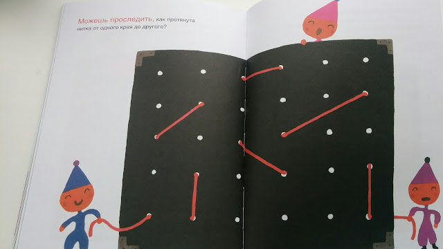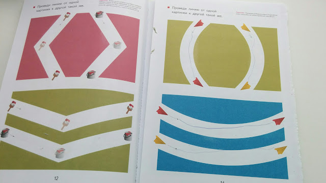 Но вообще принцип мне понравился. На обороте каждой "раскраски" задание-проводилка. Провести линию через все предметы, усложняется от начала тетради к концу.
