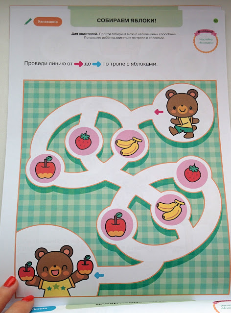 В Лабиринтах от Gakken сначала тоже идут упражнения на простые линии, затем лабиринты, но также есть задания на мышление, не только на графомоторику. Например, провести линию по тропе с яблоками (при этом на картинке также есть бананы) или провести линию, следуя по цифрам от 1 до 5.