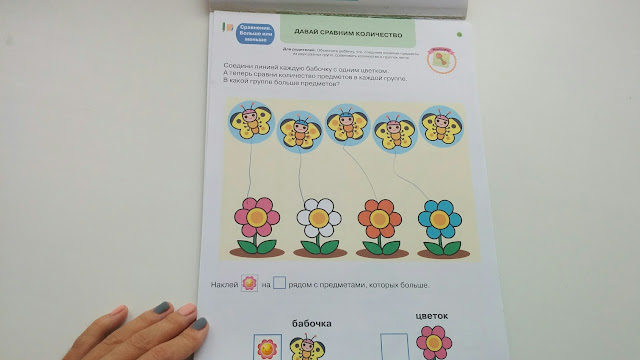 Есть и на счет, и на соединение точек, и просто на графомоторику. Много наклеек, красочно.
