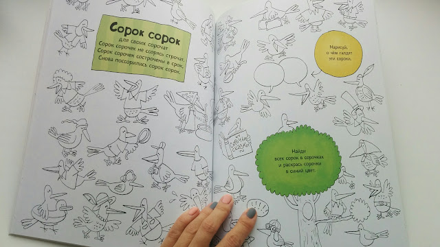 Мне очень нравятся его картинки, милые и простые, забавные. На каждом развороте скороговорка и задание на поиск.
