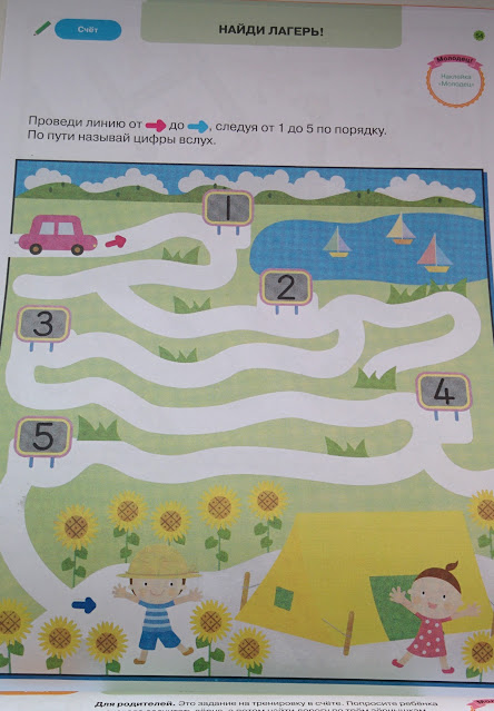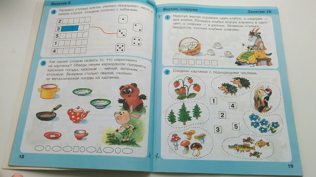 Много рисунков "соедини по цифрам", упражнений на заполнение пропусков в ряде цифр. Мне нравится!