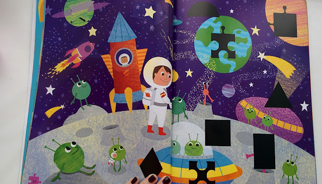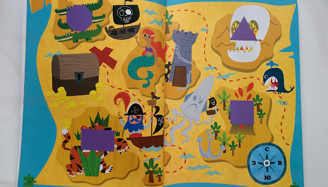 У Влада особым спросом пользуются наклейки, которые являются частью общей картинки. Началось у нас это с кумонов (о них - ниже), где довольно просто найти недостающий фрагмент. В "Стикер-Мозаике" задания уже сложнее, и на одном развороте нужно поставить сразу несколько заплаточек разной формы. Тетрадка, как мне показалось, чисто мальчиковая: космос (эту страничку Влад сразу стал заклеивать), пираты, роботы, лабаратория сумасшедшего ученого, динозавры. В общем, то что нужно!