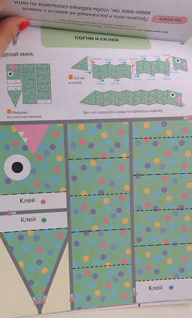 До этого у нас были тетради кумон "Давай вырезать!" и "Давай сложим картинку!". В этом пособии объединяются подобные задания, плюс еще есть аппликации. Задания расположены по нарастанию сложности, сначала совсем простые, например, сделать мальчику прическу (резать полосочки), простая аппликация с фейерверком, а затем поделки становятся сложнее. Задания не однотипные, например, в кумоне со сложением бумаги у нас было несколько почти одинаковых листов, где нужно было складывать лист пополам - получался целый фрукт и при раскрытии фрукт в разрезе.