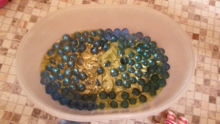 Лизунов вылили в миску, туда же высыпали аквагрунт. Возились очень долго. Понравилось им эти шарики смешивать и потом доставать.