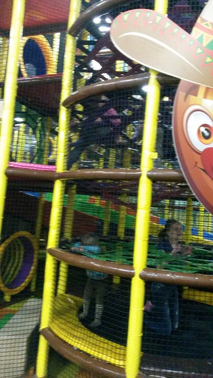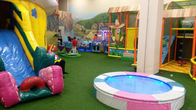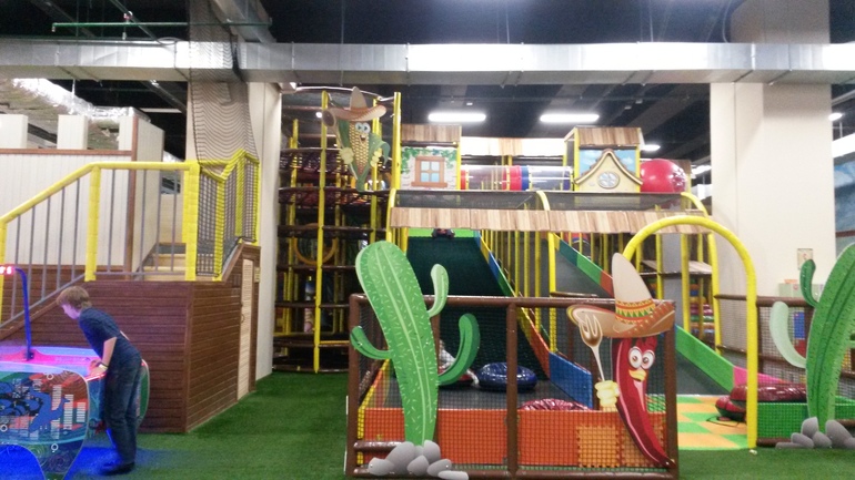 На первом этаже приличное кафе. Некоторые родители оттуда наблюдали за своими чадами. Другие родители отдыхали в креслах-мешках. На полу зеленое покрытие под травку. Приятно-мягкое. Все чистенько и аккуратненько. Одевать детей нужно легко, особенно стрелойносящихся мальчиков. Девочки еще ничего были, а Колька весь мокрый. Все Наигрались, набегались, устали, но остались в полном восторге! Один минус - от дома далеко. Метро Дубровка, ТРЦ Мозаика. Но для кого-то это плюс.