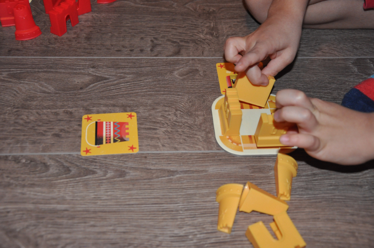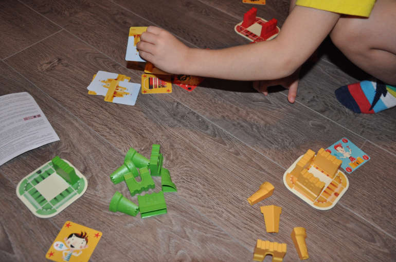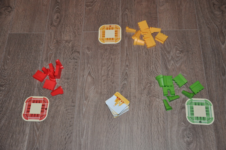 Задача - собрать замок и максимально его украсить, выбирая карточки из трех выложенных на столе. На столе всегда открыты 3 карточки, и, в свой ход, игрок выбирает 1 из 3 карточек.