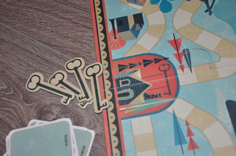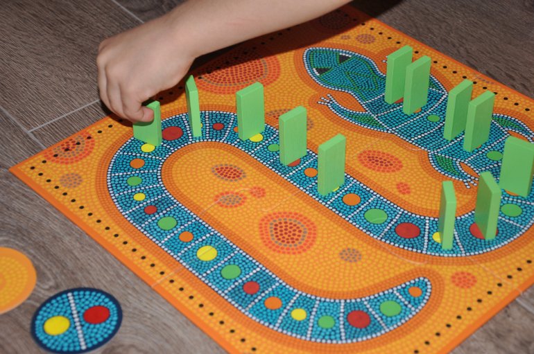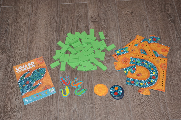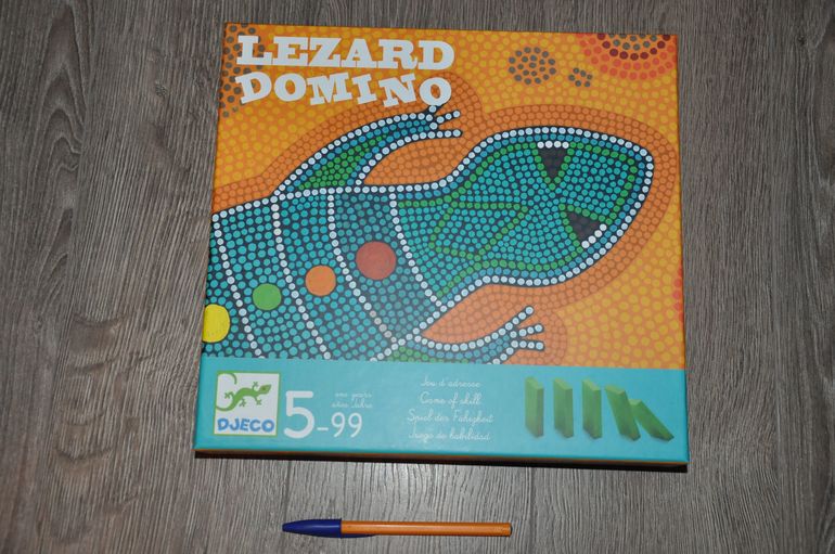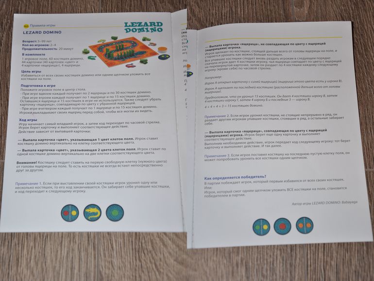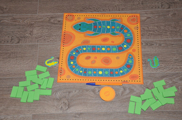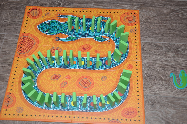 Правила просты: в свой ход открываем карточку из стопки и или выкладываем костяшки из своего запаса на соответствующие цвета на поле (идем от головы ящерицы), или щелкаем по костяшкам, чтобы раздать их другим игрокам, или совершаем еще один ход.