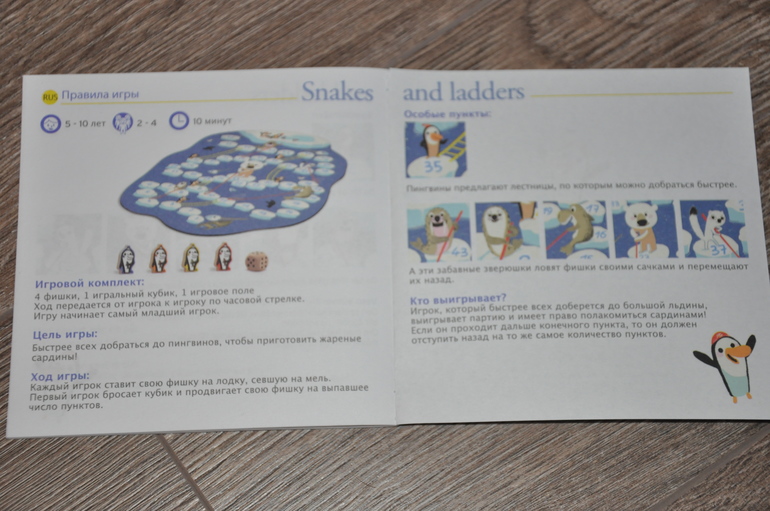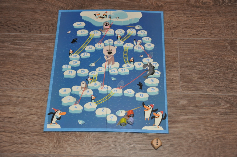 Начнем с простой и,скорее всего, всем известной игры "змеи и лестницы" - в оригинале у Djeco игра так и называется (ведь серия Classics), но вместо змей тут милые северные животные с сачками, поэтому перевод не соответствует оригиналу))