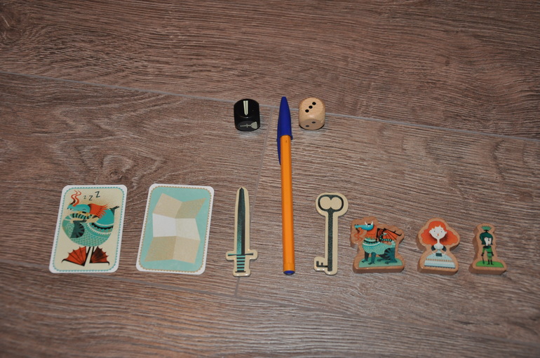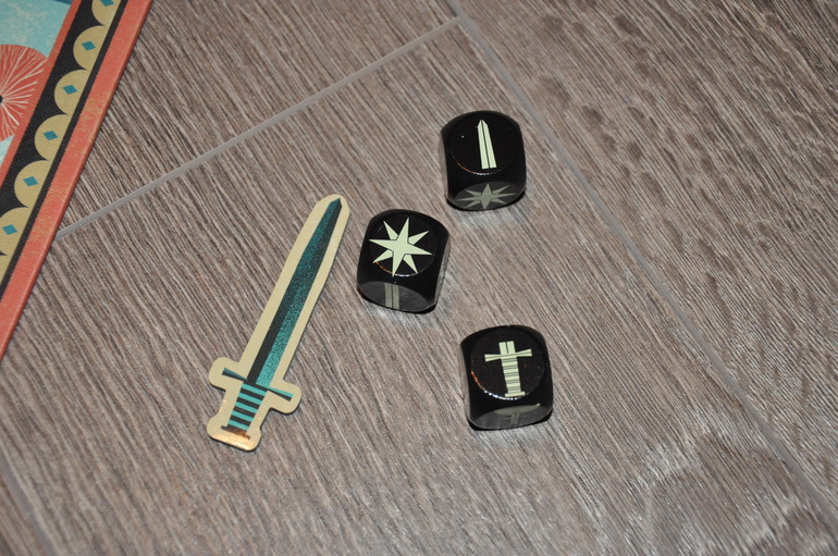 - "меч": чтобы получить его нужно выкинуть на 3 кубиках три части меча или две части меча и джокер, но ни одного "меча в камне";